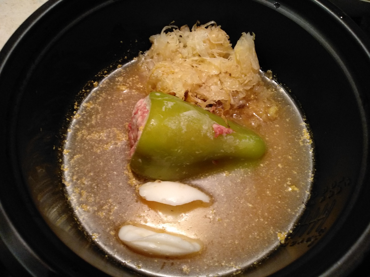 Zvládá to velmi dobře, po vaření přichází na chvíli funkce dušení, lehce připeče obsah na dně, (viz vinná klobása), ale je to nepřilnavý povrch, takže není problém, přepne na dohřívání a čeká na páníčka. Je ale potřeba brát ohled na množství vody v potravinách, což ovlivní i dobu vaření. Plněné papriky vodu pouští, rýže nebo houby vstřebávají. Nespoléhejte ale na ten automat, je potřeba to i občas pohlídat. Když budete mít pocit, že už je uvařeno, stačí odstranit poklici, voda se dříve odpaří a rychleji i přepne, a naopak, když máte dojem, že to přepnulo příliš brzy, tak stačí přidat vodu a znovu nastavit do varného režimu. Já přidávám lžíci sádla, aby se to v poslední fázi nepražilo, ale smažilo. Když jsem se pochlubil se svým výzkumem kamarádům, tak nechtěli věřit, a závěr zněl:
