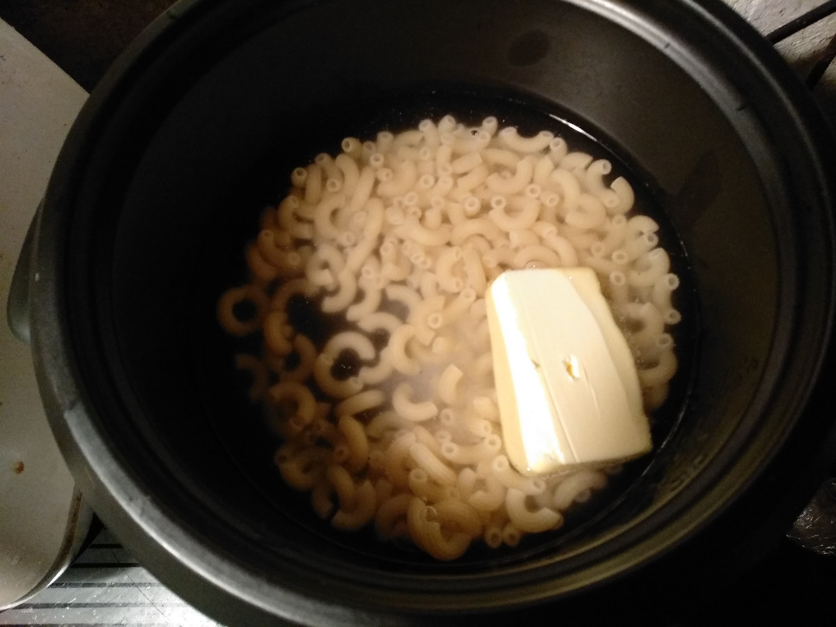 První pokus byl uvařit v něm vodu, to umí, ale vaří pořád, a pokud je tam voda, tak nepřepne. Druhý pokus byl už s rýží. Tak jednu odměrku rýže a tři vody a osolit. No, povedlo se. Rýže plný hrnec jak pro zástup Číňanů, a tak jsem zjistil, že slepice taky rády rýži. Pomalu mi ale začala docházet funkce toho zázraku. Je tam někde malinké teplotní čidlo, které přepíná vaření 400W + dohřívání, tipuji tak dvacet wattů, udrží teplotu, ale znova neohřeje. Funguje tak, že pokud je v hrnci voda, znamená to, že obsah se drží do sto stupňů a vaří a vaří. Když se voda vyvaří a obsah malinko překročí stovku, přepne do udržovacího režimu. Takže jde říci, že množství vody určuje dobu vaření.