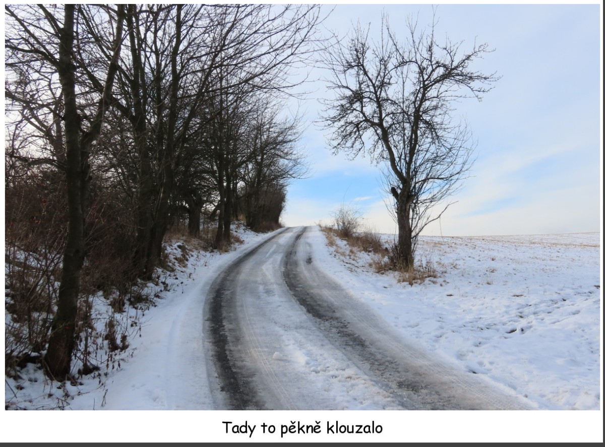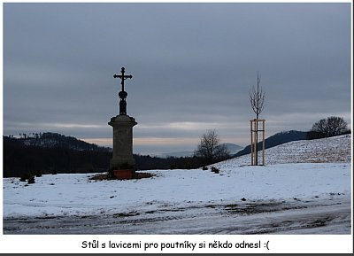 Hned ráno mi bylo jasné, že plán je plán a skutečnost je skutečnost. Vrátila se obvyklá šeď, která už mě nemohla zastavit. Na startu v Lovečkovicích nebyla ani ta mufloní noha v ohradě, natož člověčí. Byla tam však slabá sněhová vrstvička, slibující nevšední zážitky. Všechno zlé je pro něco dobré, a tak jsem měla možnost spatřit Bukovou horu, jak vypadala před tím, než na ní vztyčili vysílač, který jinak září do dáli jako maják. Toho dne tam jaksi nebyl ... Prošla jsem lesíkem k silnici a křížku u Hlupic, kde jsem minule seděla na sluníčku na lavicích se stolem. Křížek tam sice stojí, lavice nikoliv. Svádí to sice k domněnce, že je třeba na zimu uklidili, ale skutečnost je taková, že je někdo prostě ukradl. Přeji zloději v duchu, aby se mu zadřela pořádná tříska, víte kam :)
