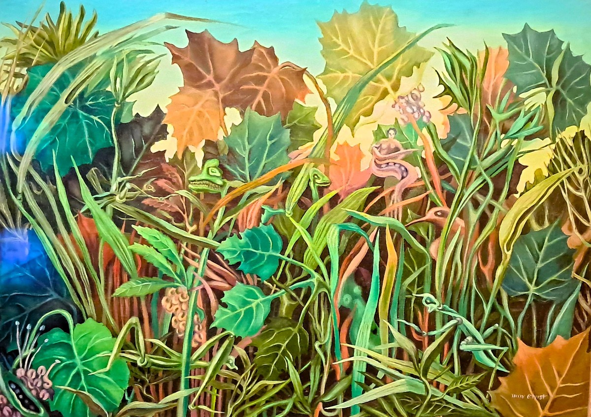 Max Ernst, Zahrada osídlená chimérami, olej na plátně, 1936