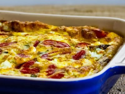 Papriky očistíme, nakrájíme a opečeme na pánvi na oleji, rajčata také. Česnek nakrájíme na plátky a rovněž opečeme. Vejce romícháme s tavenými sýry, špetkou libečku a soli. Do zapékací misky uložíme rajčata, papriky, česnek a zalijeme vaječnou směsí. Potom několik minut zapékáme.