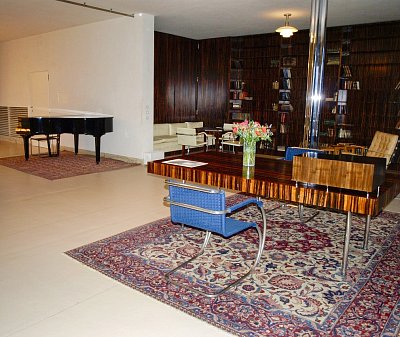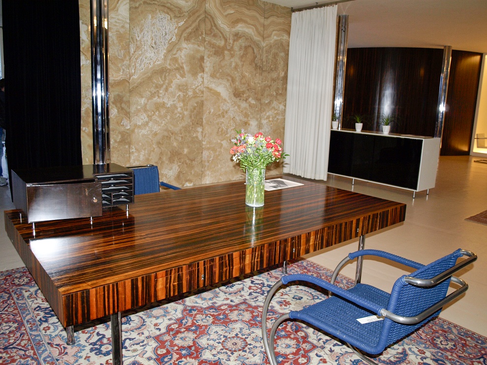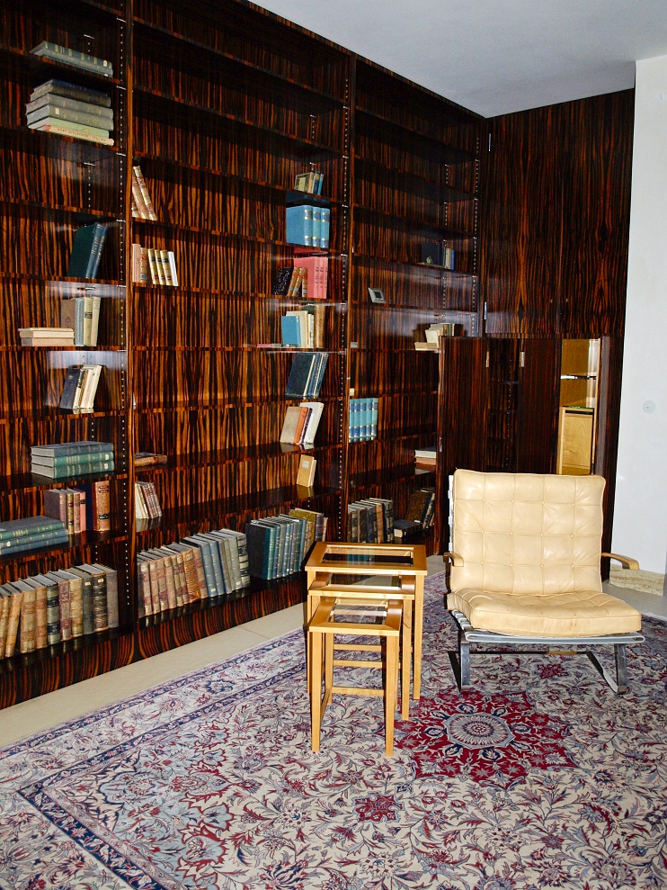 Nad klavírem (vlevo nahoře) se nachází okénko projektorové komory, z níž ve 30. letech Fritz Tugendhat promítal filmy, ale i své diapozitivy a amatérské záběry. Prostor za bufetem sloužil jako pracovna, které dominuje velký pracovní stůl s dýhou z makassarského ebenu, doplněný židlemi typu Stuttgart s područkami. Obytné prostory zdobí a osvětlují přesné repliky ikonické lustrů dánského architekta Poula Henningsena (1894 - 1967). Také vestavěná knihovna (v pozadí), jako jedna z mála v původním stavu, je obložena exotickou dýhou z makassarského ebenu, sahající od podlahy až ke stropu. Prohlédli jsme si bridžový stolek s posezením v barvě slonovinové kosti a volně stojící křeslo Tugendhat v béžové kůži s knoflíkovým štepem a područkami (v galerii). Křeslo Tugendhat bylo navržené Miesem v roce 1930 přímo pro brněnskou vilu a nese název podle majitelů. Také v knihovně je podlaha pokryta perskými koberci.