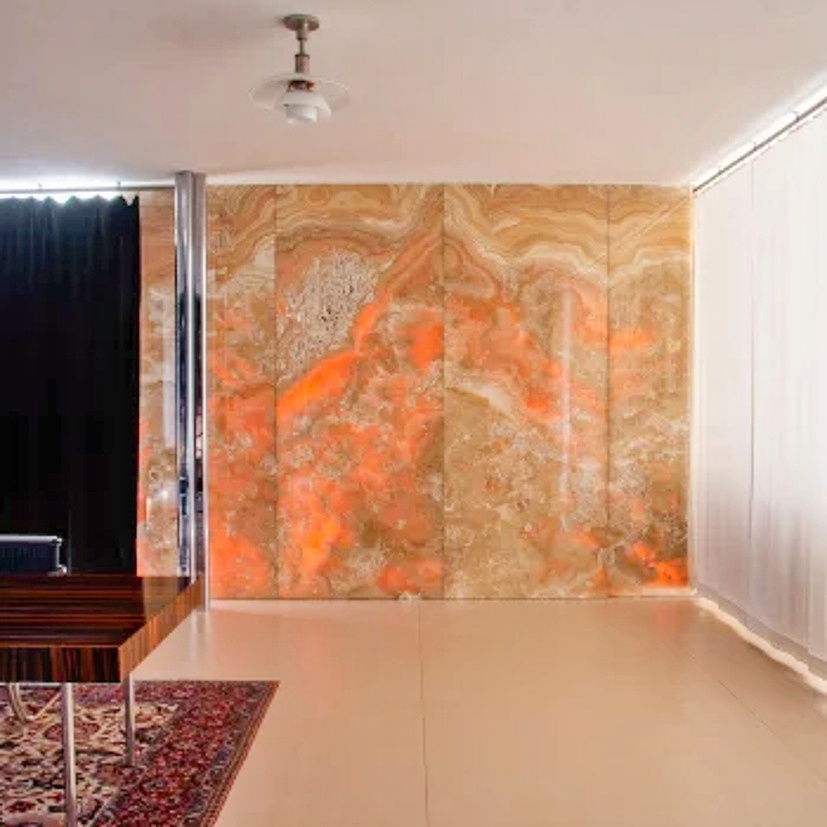 Má však jedinečnou vlastnost. Pod určitým úhlem propouští sluneční paprsky a mění se tak jeho barva (foto v galerii z webu MMB). Architekt Mies horninu objevil v Hamburku, kde prý byla určena k výrobě dvou velkých váz pro luxusní zaoceánský parník. Nevzdal se však možnosti získat ji pro brněnskou vilu, a to i přes značnou nákladnost. Pořízení onyxové stěny přišlo na 200 000 prvorepublikových korun. Osobně pak dohlížel na přesné rozřezávání bloku a sestavení ploten tak, aby správně vyšla kresba kamene. Když se prý dodatečně ukázalo, že je kámen průsvitný a že určitá místa onyxové stěny, prosvětlená zapadajícím sluncem, rudě září, bylo to pro něj velmi radostné překvapení. Tomu se říká kouzlo nechtěného :-))