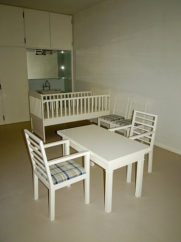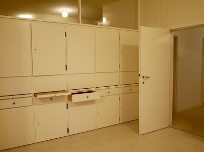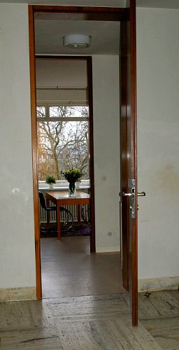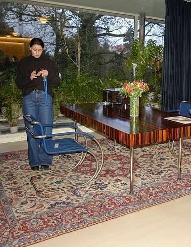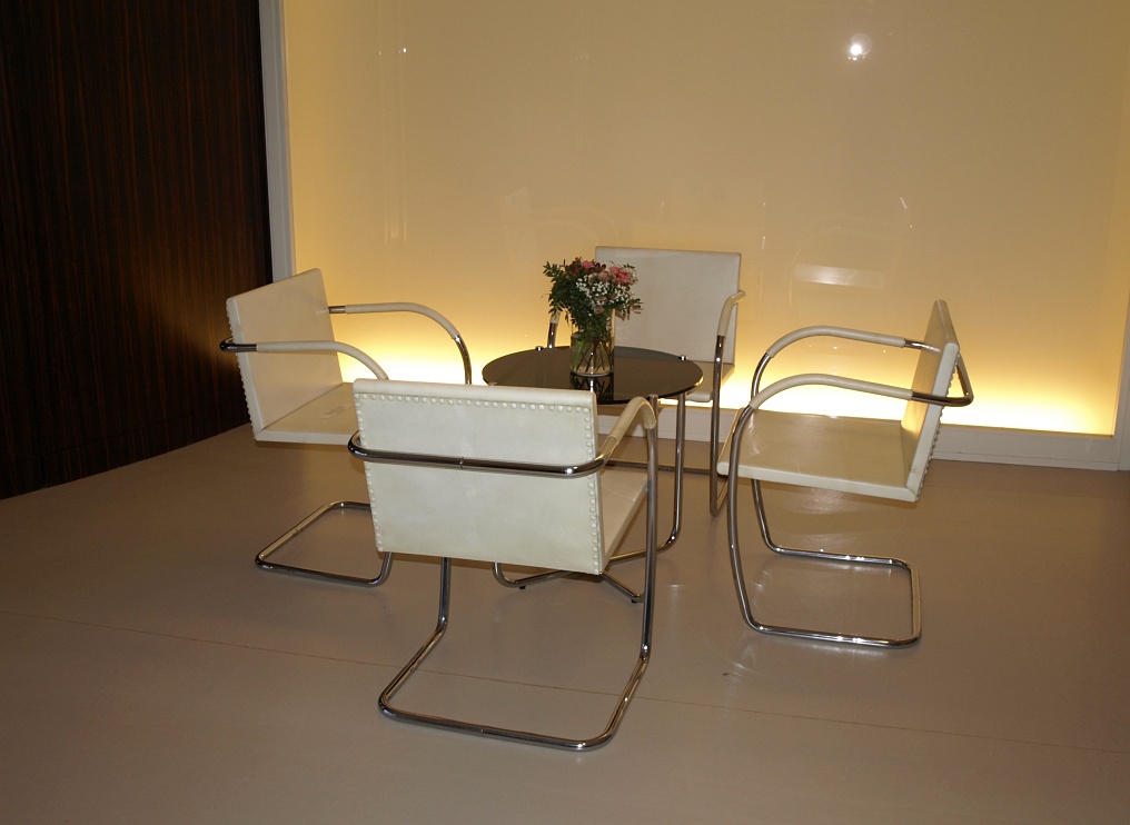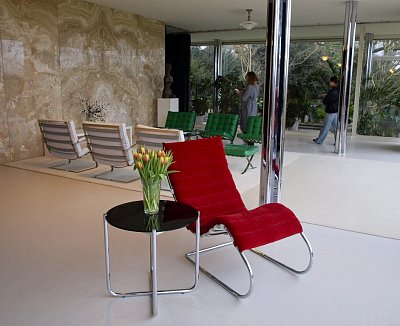 U stěny stojí kulatý stolek se dvěma křesly typu Stuttgart s područkami a ratanovým výpletem. Na podlaze a na schodišti (na snímku uprostřed pod mléčným sklem), kterým se sestupuje do hlavního obytného prostoru vily ve druhém nadzemním podlaží, byl použit italský travertin, pocházející z italského Tivoli, z oblasti Lazio. V tamních lomech se však již několik let travertin netěžil a Mies si proto nechal části lomu znovu otevřít. S ohledem na počasí a ochranu nákladných podlahových krytin jsme všichni získali na své obutí "slušivé" plastové návleky (přístroj, podobný vysavači, je ve fotogalerii).