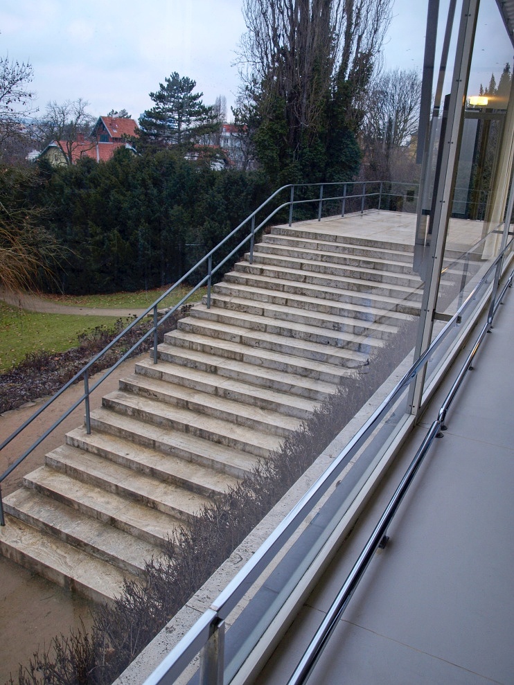 Horní terasa nabízí nádherný pohled na historické panorama města (v galerii). Vzhledem k poloze stavby ve svahu zvolil Mies van der Rohe jako nosný systém ocelový skelet, který je konstruován z 29 sloupů z nýtovaných L profilů (na snímku tři z nich), železobetonové stropy a cihelné zdivo. Nosné ocelové pilíře architekt nijak neskrýval, jen je v obytné části nechal obalit chromovanými krytkami. Velmi subtilní ocelová konstrukce s lesklým chromovým krytím tak umožnila volnou variaci tzv. plynoucího prostoru. Terasy a všechna schodiště mají travertinové obklady.