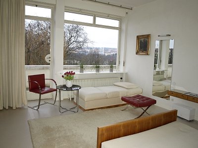 Podlahu před onyxovou příčkou pokrývá koberec ze světlé přírodní vlny, ručně tkaný Alen Müller-Hellwigovou v německém Lübecku. Stávající společenské posezení se skládá ze tří křesel a jednoho taburetu Barcelona ve smaragdově zelené kůži, tří křesel Tugendhat se stříbrošedým látkovým potahem a stolku. Křesla Tugendhat mají rám z ploché chromované oceli a výrazným prvkem jsou pryžové popruhy. Prohlíželi jsme si je i v pokoji vychovatelky a v knihovně.