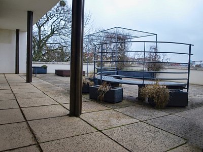 Na jihovýchodní stěně horní terasy návštěvníky zaujme tzv. archeologické okénko (vlevo nahoře za třetím sloupem, cca 1 m²), kde je odhalen původní povrch fasády. Zahradní terasa měla ryze privátní charakter. Kromě pokoje vychovatelky je přístupná z každé ložnice i z předsíňky za vstupní halou, která odděluje pokoje paní Grety a chlapců. Děti mívaly na terase vaničku s vodou na šplouchání a bednu s pískem na bábovičky, jezdily zde na svých autíčkách a kolečkách. Pergola bývala porostlá zelení, tvořící příjemný stín, zábradlí obloukové lavičky ovíjely popínavé rostliny.