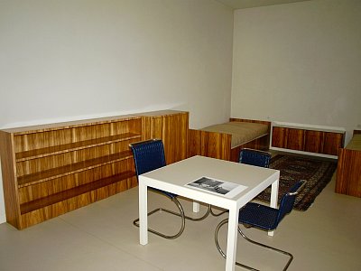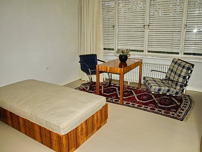 Budoár Grety Tugendhat kombinuje funkci ložnice a dámské šatny. Nalevo podél stěny jsou původní vestavěné skříně s palisandrovou dýhou, pod oknem stojí menší odpočinkové sofa. Nechybí zrcadlo a toaletním stolkem, před ním stolička Barcelona (Miesovou specialitou bylo pojmenování jednotlivých kusů nábytku). Židle s názvem Brno z pásové oceli s potahem z třešňově červené kůže a kulatý stolek z trubkové oceli byly Miesem navrženy přímo pro tuto vilu. Architekt ji hojně používal i ve svých pozdějších realizacích a židle se stala bezesporu jednou z nejproslulejších ikon světového designu 20. století. U vestavěné skříňové stěny jsou dveře, kterými paní Greta procházela přes malou předsíňku u terasy přímo do pokoje chlapců. Podlahu zdobí koberec z bílé ovčí vlny s vysokým vlasem. Nádherný, měkoučký, ale s ohledem na svůj vztah k domácím pracím bych ho doma nechtěla ... ;-)