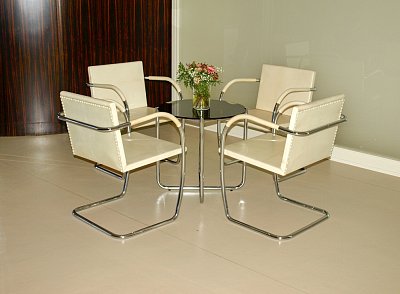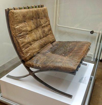 Předběžná studie křesla Barcelona (1928). Mies použil místo dřeva chromovanou ocel. Ohnuté pásy vytvářely elegantní křivku. Výroba byla technicky velice náročná. Ocelový rám se ručně svařoval a brousil, polštáře byly z kůže a koňských žíní.