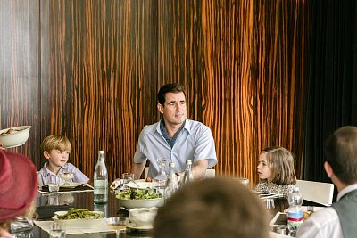 V popředí je patrný křížový profil jednoho z 29 nosných sloupů s lesklým chromovým krytem. Z jídelny je možné vstoupit na zahradní travertinovou terasu.