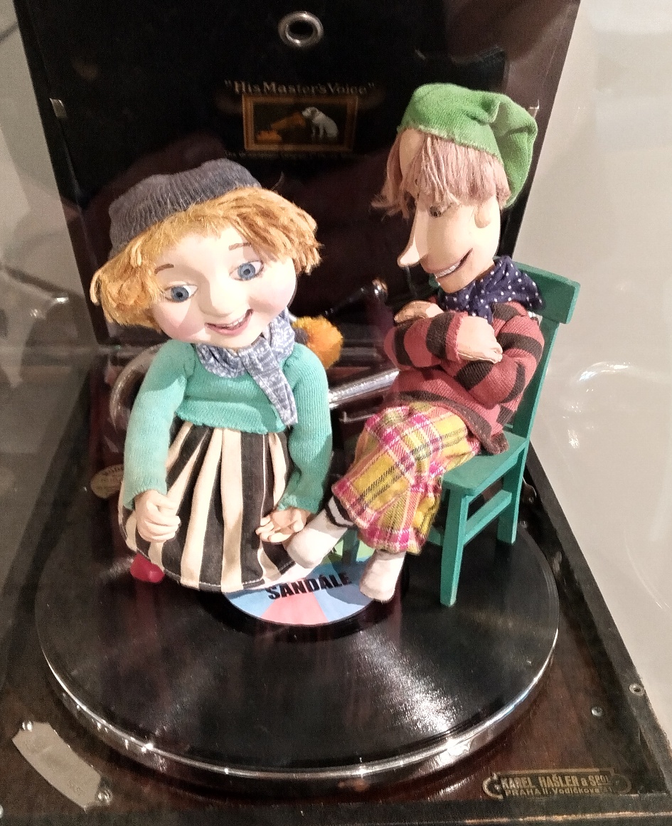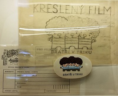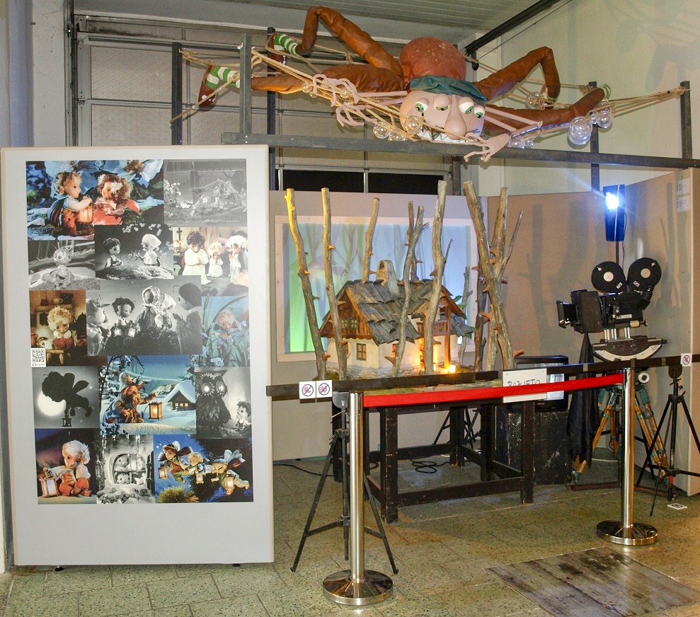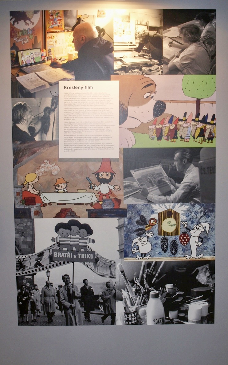 Ve výstavních vitrínách naleznou návštěvníci velké množství artefaktů, od originálních loutek z pohádek (v galerii) přes ukázky filmových pásů či některých krátkých reprodukcí televizního pořadu Večerníček. Vlevo na snímku dnes už téměř nesehnatelná kniha, vpravo návrh oblečení táty Josefa z osvětového večerníčku Povídání o mamince a tatínkovi.