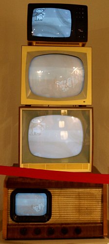 Odspodu: První československý sériově vyráběný televizor Tesla 401A, výroba 1953 - 1957. Velikost obrazovky 15 x 20 cm. Umožňoval příjem pouze jediného kanálu a zpočátku také jediného vysílače na Petříně s dosahem v Praze a okolí. Televize vysílala jen pár dnů v týdnu a jen několik hodin denně. Tesla Azurit se vyráběla v letech 1962 - 1963. Od počátku ji provázela vysoká nespolehlivost, kterou dokonce řešila ministerská komise. Po provedení zásadních změn už televizor sloužil tak, jak měl. O patro výš vidíme na svou dobu velice moderní Teslu Luneta, vyráběnou od roku 1964 do 1965, která byla během 70. let doplňována konvertory pro příjem nastupujícího druhého programu ČsT. Vrcholem pomyslné televizní pyramidky je přenosná Tesla Pluto z let 1982 až 1984. Napájená byla nejen ze sítě, ale i autobaterie a mnozí z nás ji měli ve svých dětských pokojíčcích. Spolehlivé polovodičové zapojení umožnilo těmto přijímačům dlouhý život na chatách a chalupách prakticky až do konce analogového vysílání v roce 2011.