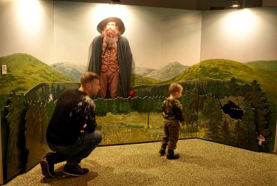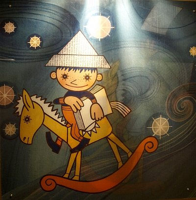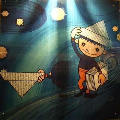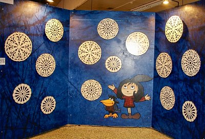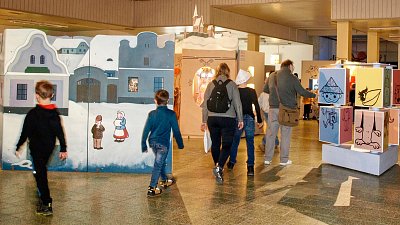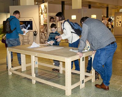 Velcí i malí návštěvníci si mohli z papírů s logem České televize složit večerníčkovskou čepici (vlevo) a vyrazit na prohlídku. Vpravo panel, přibližující tvorbu hraných večerníčků. Bližší informace bylo možné získat v obrazových a zvukových smyčkách pomocí sluchátek, které byly u všech panelů. Další zajímavé panely ve fotogalerii.