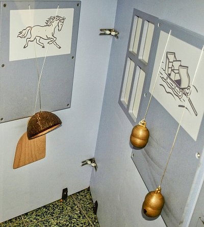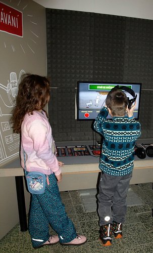 Díky interaktivním prvkům se chlapeček na snímku stal na chvíli loutkohercem. Pomocí jednoduchých táhel cvičí pravou rukou s Hurvínkem, zatímco díky jeho levé ruce žehlí taťka Spejbl prádlo :-) Vpravo ukázka ruchového studia, kde se dodatečně nahrávají zvuky, které nejsou dostatečně zachyceny během vlastního natáčení. Například zvuky oblečení (šustění kabátu, zip ..), kroky na dlažbě, klapot kopyt, vítr a podobně.