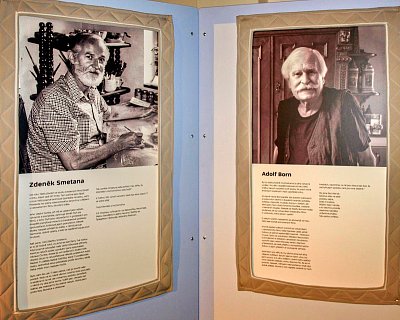 Na několika výstavních panelech se návštěvníci výstavy seznamují s osobnostmi, které se na vývoji večerníčkových pohádek podílely mnoho let. Zleva režisér, výtvarník a scénárista Zdeněk Smetana, výtvarník a ilustrátor Adolf Born, výtvarník a filmový animátor Jan Tippman a ilustrátorka, malířka a knižní grafička Gabriela Dubská. Další ve fotogalerii.